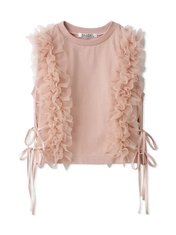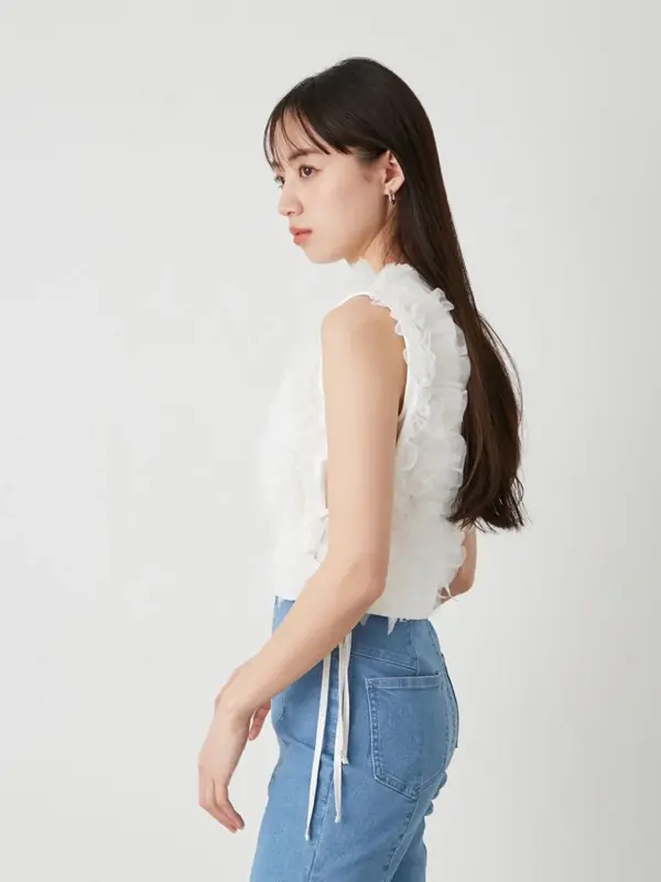 A top made of casual cut-and-sew fabric that can be worn elegantly like a pretty blouse. The frills are made of elegant organza with a glossy finish, and are luxuriously placed from the shoulders to the hem on the front and back to add a touch of glamour. Two long satin ribbons are placed at the waist on both sides to enhance the cuteness. The design is a moderate short length that goes well with high-waisted bottoms. This item will make your outfit look more glamorous with just one addition.